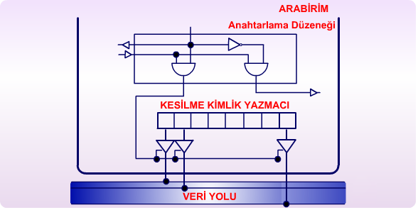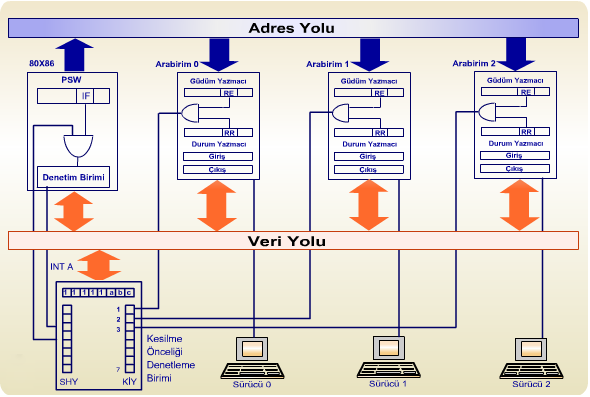 Yukarıda tek bir sürücü için örneklenen işlemler, çok kullanıcılı bir bilgisayar sisteminde, aynı anda birden çok sürücü üzerinde gerçekleştirilmek zorundadır. Bunun için çoğu kez, sürücü-arabirim arası aktarım işlemleri bir kez başlatıldıktan sonra, arabirimlerin, aktarım sonunda ana işlem birimini uyarması öngörülür. Bu yolla ana işlem biriminin birden çok arabirimi eşanlı olarak denetleyebilmesi sağlanır. Arabirimlerin ana işlem birimine yolladıkları işlem sonu uyarıları, kesilme uyarıları olarak adlandırılır. Değişik giriş/çıkış arabirimlerinden aynı anda ve zamanuyumsuz olarak gelen bu uyarıların, hiçbir veri kaybına yol açmadan ve bu birimlerin öncelik sırası gözetilerek ele alınması kesilmelerin yönetimi olarak bilinir. Kesilmelerin yönetimi giriş/çıkış sistemi kapsamında düşünülür.