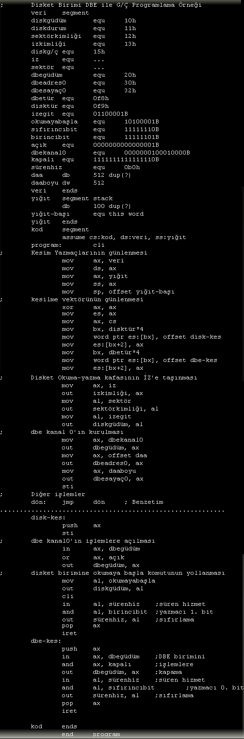 Ortalama alma amacıyla geliştirilen bir programda, ortalamaya giren değerlerin toplanması, toplamın öge sayısına bölünmesi işlemleri sorunun çözümüne özgü işlemlerdir. Ortalamaya giren değerlerin klavyeden okunması, elde edilen sonuçların ekran, yazıcı gibi birimlerden görüntülenmesi ise giriş/çıkış işlemlerini oluşturur. Verilerin diskten okunması, ekranda görüntülenmesi, yazıcıdan dökülmesi gibi giriş/çıkış işlemleri, üst düzey programlama dilleriyle, birkaç komutla yerine getirilen işlemler olarak algılanır. Ancak derleme sonucunda elde edilen amaç programlar içinde, bu işlemlere ilişkin kesimler de önemli bir yer tutar.