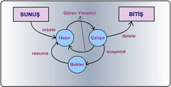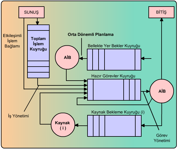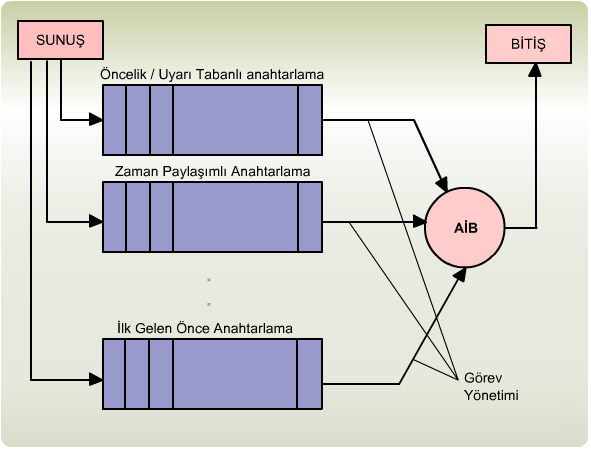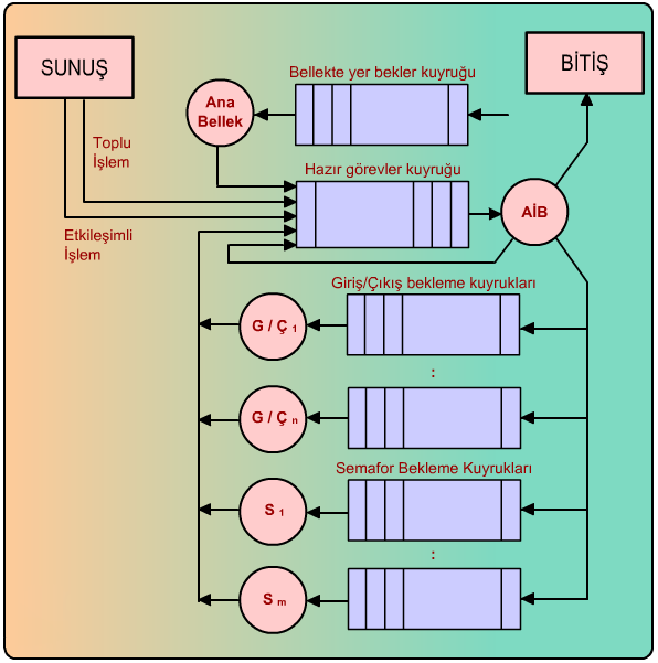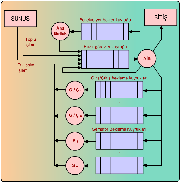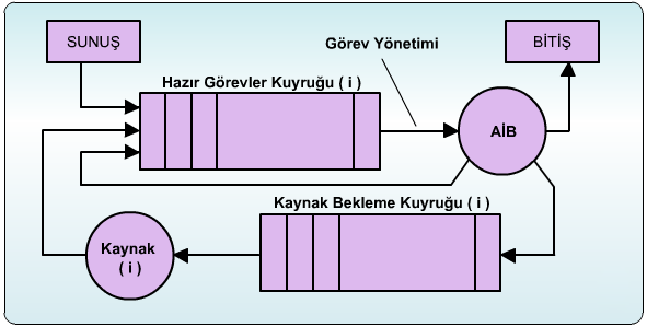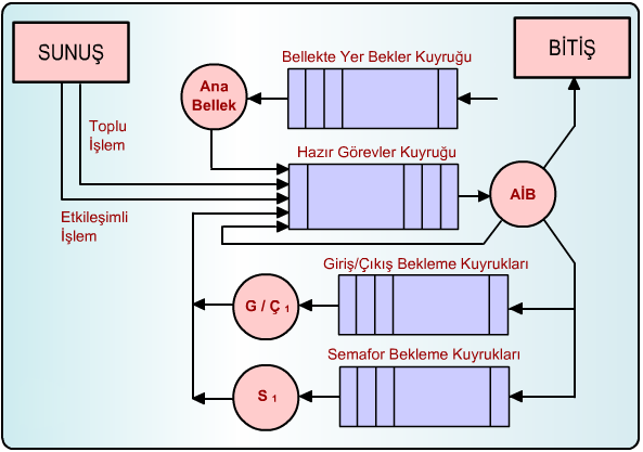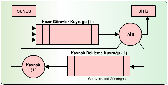 Görevler, işletimlerinin başından sonuna değin ya ana işlem birimi üzerinde çalışır durumda, ya bu birimi kullanmaya hazır durumda ya da başlattıkları bir giriş/çıkış işleminin (örneğin diskten bir öbeğin okunması işleminin) tamamlanmasını bekler durumda bulunurlar. Görevler çalışmadıkları sürece, hazır, bekler gibi adlarla anılan kuyruklara bağlı olarak tutulurlar. Görevler ana işlem birimine hazır görevler kuyruğu üzerinden anahtarlanırlar.