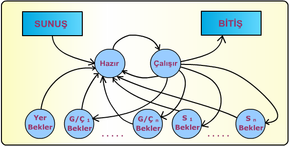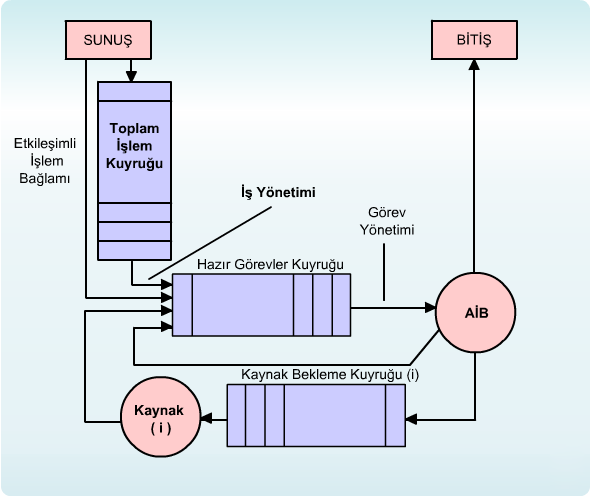 Bilgisayar sistemi donanım birleşenleri arasında en önemli kaynağı oluşturan ana işlem biriminin daha verimli kullanılabilmesi, bu birimin bekler durumda kaldığı süreleri kısaltmakla olanaklıdır. Bu sürelerin kısaltılması aynı anda birden çok işi işletime almak yoluyla gerçekleştirilir. Anımsanacağı gibi, aynı anda birden çok işin işletime alınması, bir işin işletimi sonlanmadan diğer işlerin de işletimlerinin başlatılması demektir. İşletimi sürdürülen bir işin giriş/çıkış işlemi başlatması durumunda, ana işlem biriminin boş kalmasını önlemek üzere yeni bir iş işletime alınarak çok iş düzeni kurulur. Aşağıdaki çizimde, bu yolla, 3 değişik işin birlikte işletimi örneklenmiştir.