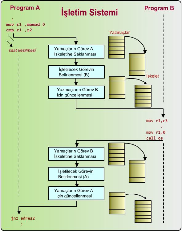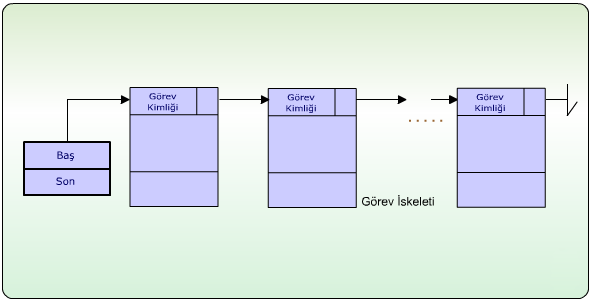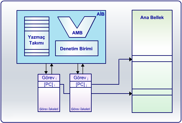 Böylece, programlar komut satırları olarak değil de, işletim bilgilerinin tutulduğu, görev iskeleti, denetim öbeği gibi adlarla anılan veri yapılarıyla ele alınmış olurlar. Sistem yönünden bakıldığında birlikte işletilen komut dizileri (programlar) yerine değişik görev iskeletleri ya da denetim öbekleri arasında anahtarlanan bir ana işlem birimi söz konusu olur. Programın, işletim aşamasında, iskelet adlı veri yapısı ile ele alınan biçimine görev adı verilir. Görev, özellikle, ana işlem biriminin yönetimi açısından önemli ve temel bir kavramdır. Bu kavrama, Görev Yönetimi adlı konu başlığı altında, ayrıntılı olarak yeniden dönülecektir.