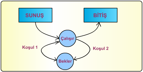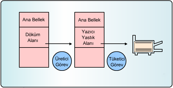Bunu örneklemek üzere, örnek çizimin ilk kesiminde, işlerin, ana işlem birimi kullanım sürelerinin kısa sürdüğü varsayılmış, bu durumda ana işlem biriminin, işlerin giriş/çıkış işlemlerinin tamamlanmasını beklemek üzere boşta kaldığı; çizimin ikinci kesiminde ise, bunun tersine, işlerin, ana işlem birimini uzunca süreler ellerinde tuttukları varsayılarak işlerin giriş/çıkış işlemleri sonlandıktan sonra ana işlem biriminin boşalmasını bekledikleri durum örneklenmiştir.
